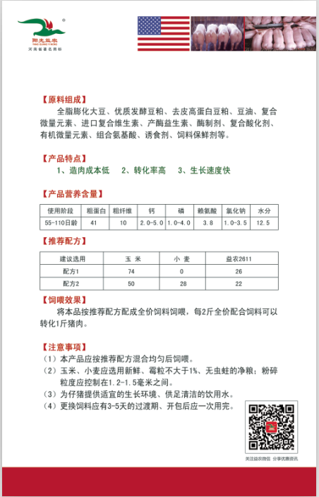 九、飼喂效果:将本品按推薦配方配成全價飼料飼喂,每2斤$±§ 全價配合飼料可(kě)以轉化(huà)1斤豬肉。