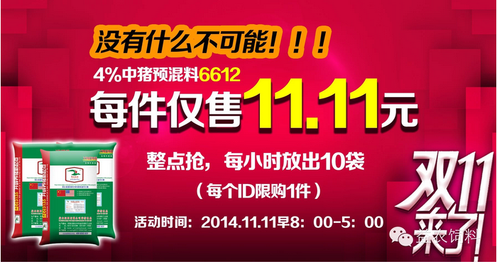 六、特惠時(shí)間(jiān):2014年(nián)11月(yuè)11日(rì)上(shàng)午8:00開(kāi)始--下(xià)午17:00結束,整點放(fàng)送,每小(xiǎo)時(shí)10袋(每個(gè)IP地(dì)址限購(gòu)1袋)。