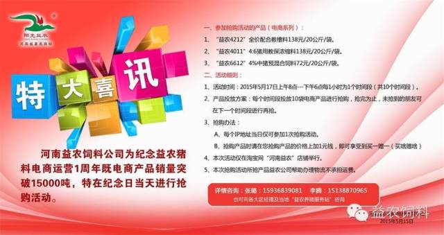 特大(dà)喜訊:河(hé)南(nán)益農(nóng)飼料公司為(wèi•€§∏)紀念益農(nóng)豬料電(diàn)商運營1周年(nián)既電(diàn)商産品銷量突破15000噸,特在紀念日(rì)當天進行(xíng)***活動₩©,具體(tǐ)方案如(rú)下(xià):